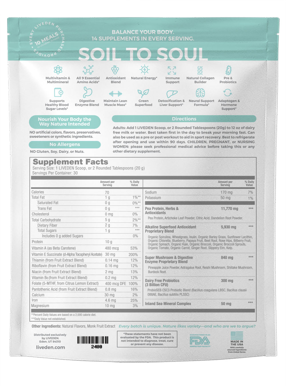LIVEDEN BALANCE is allergen free. We are Non-GMO, Gluten Free, Dairy Free, Soy Free, and Nut Free.